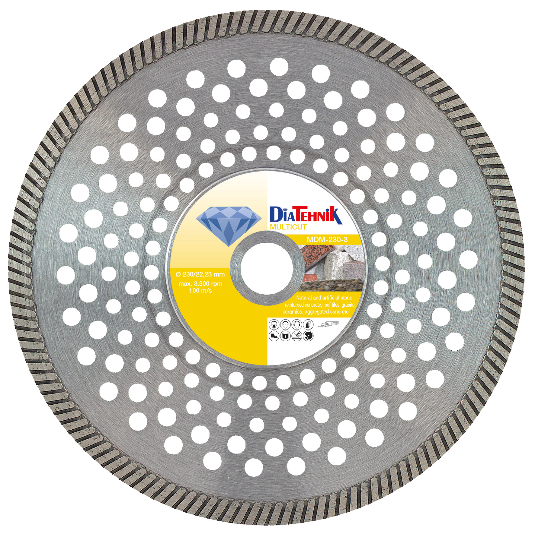 - Discul diamantat DiaTehnik este recomandat pentru tăierea materialelor precum: alei cu piatră, beton universal, marmură sau țiglă din piatră;